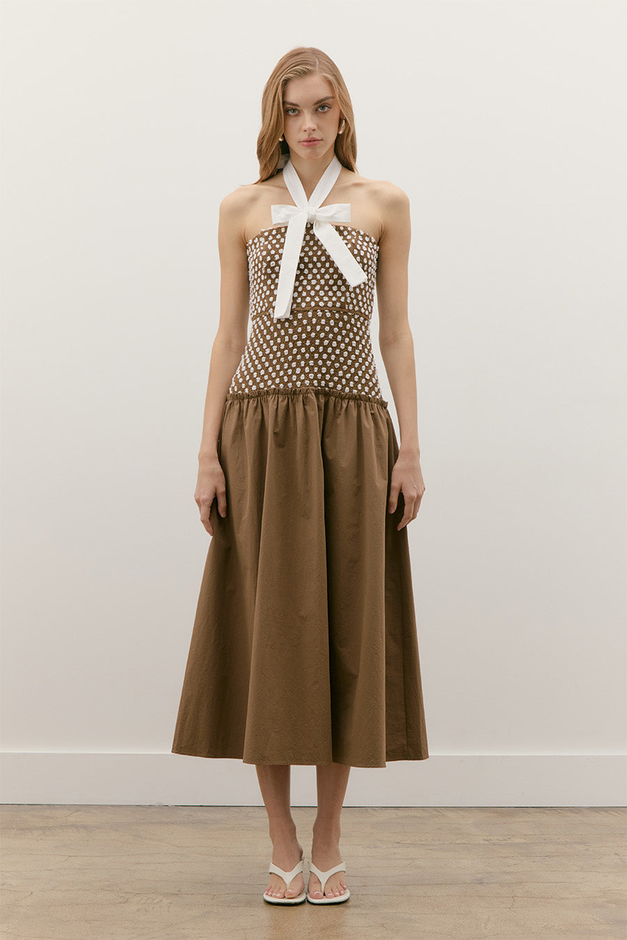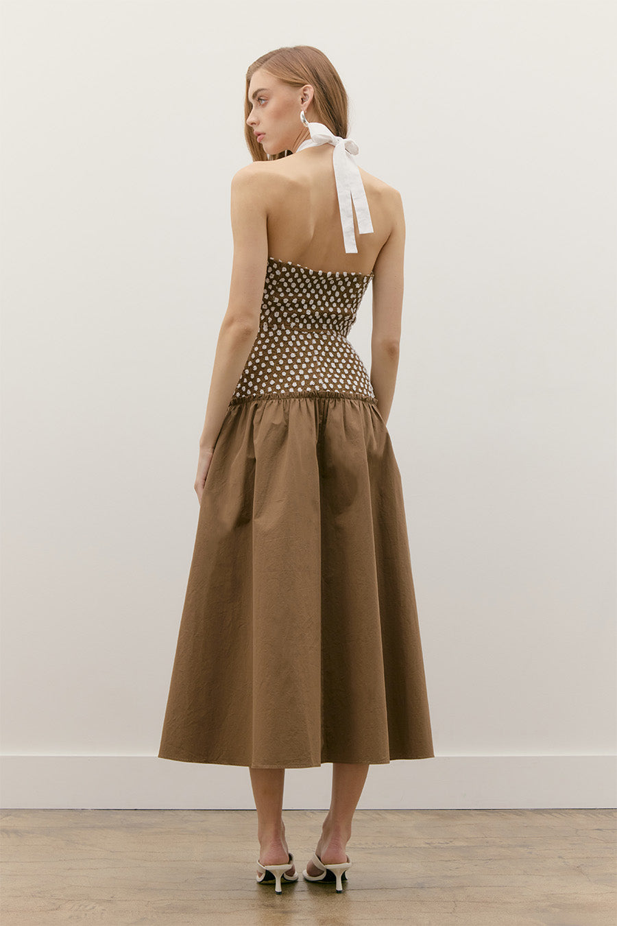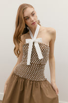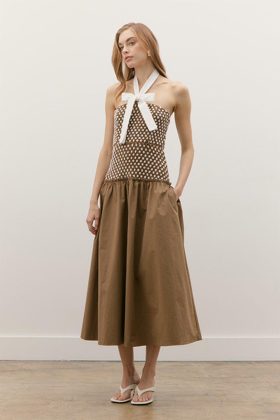 DOTTED KNIT AND FLARED POPLIN COMBO HALTER MIDI DRESS WITH FRONT NECK TIE