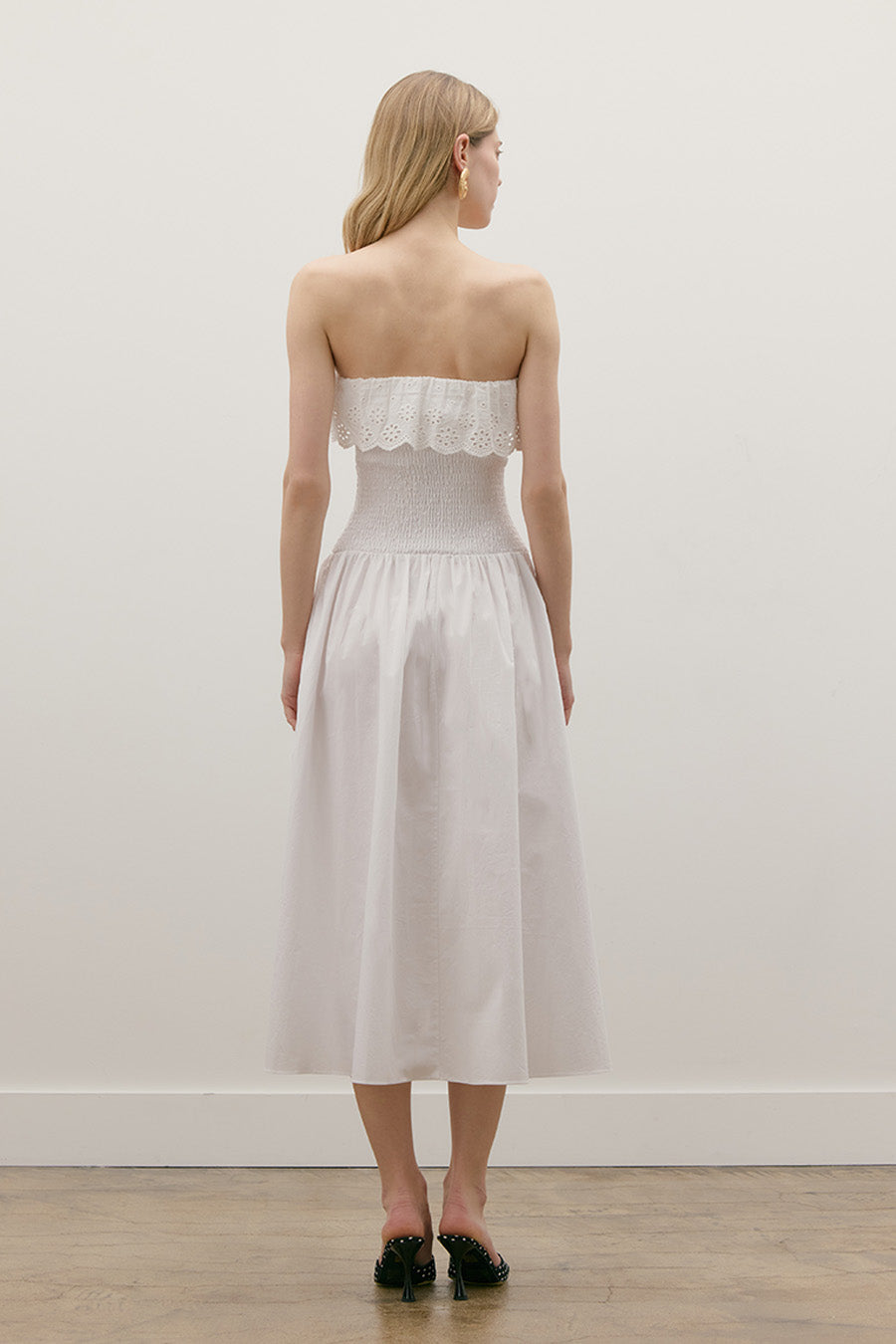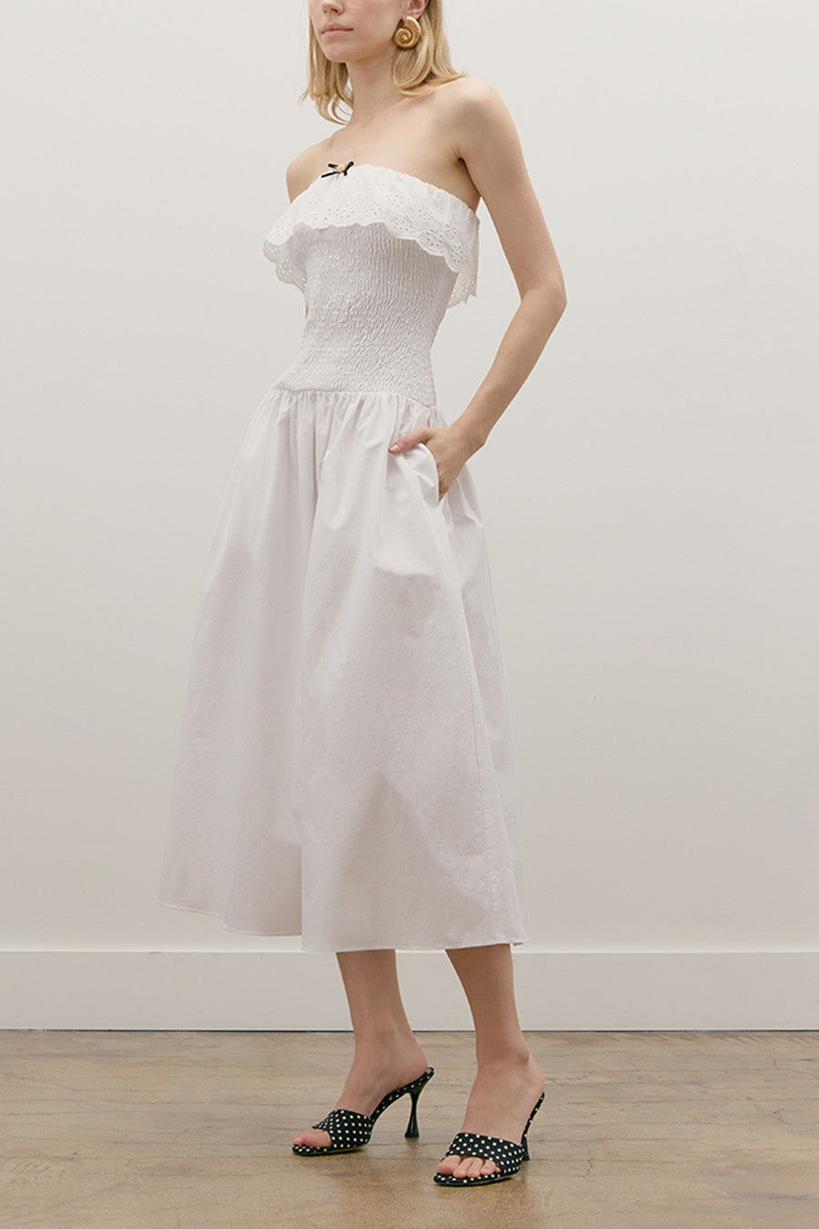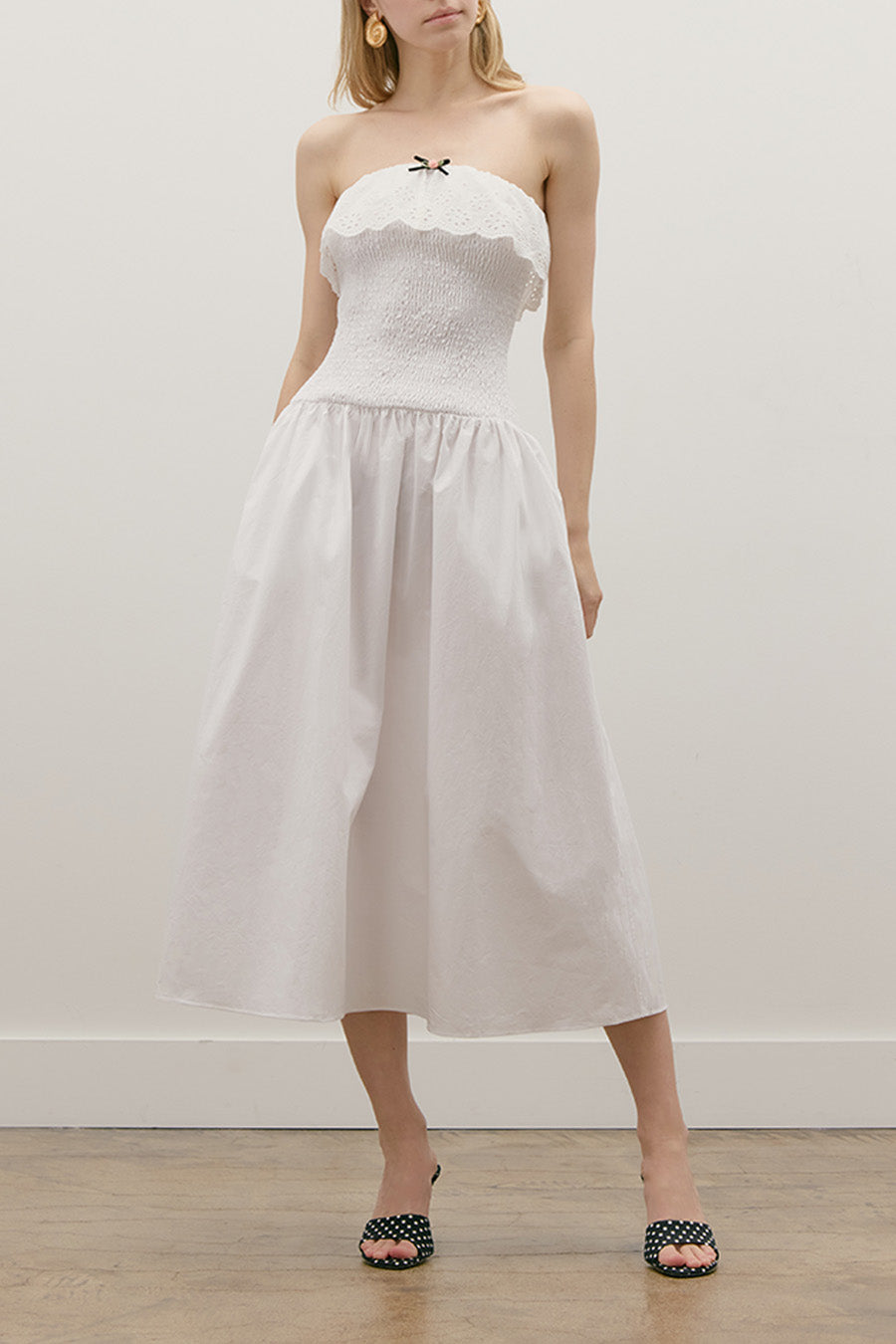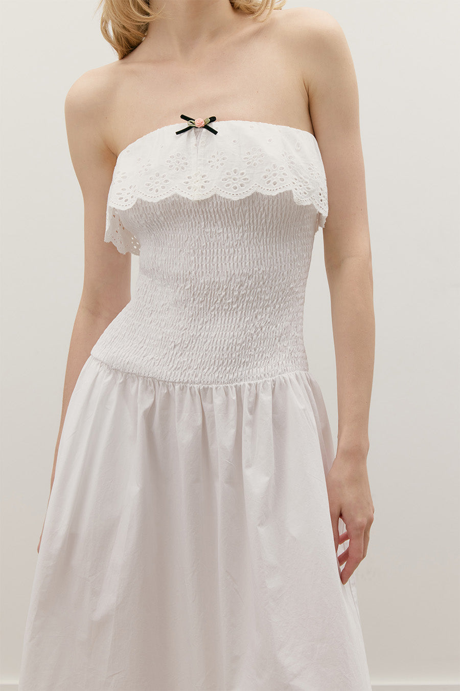 COTTON POPLIN SMOCKED MIDI TUBE DRESS WITH ROSEBUD BOW DETAIL