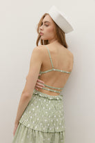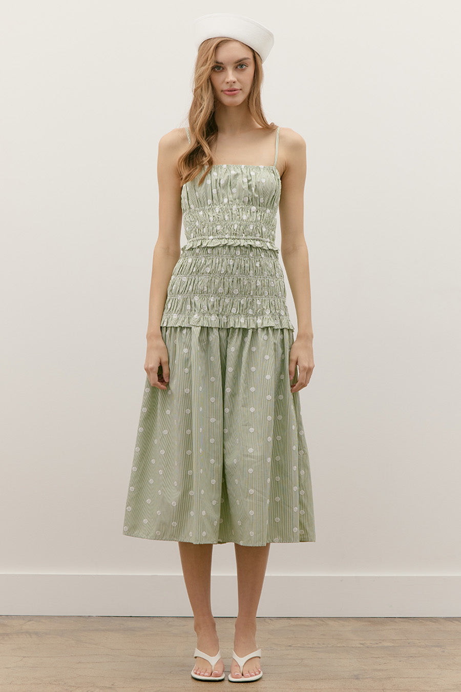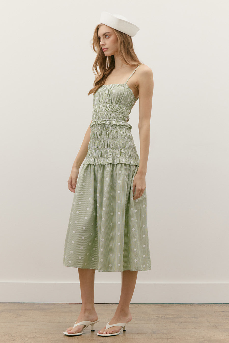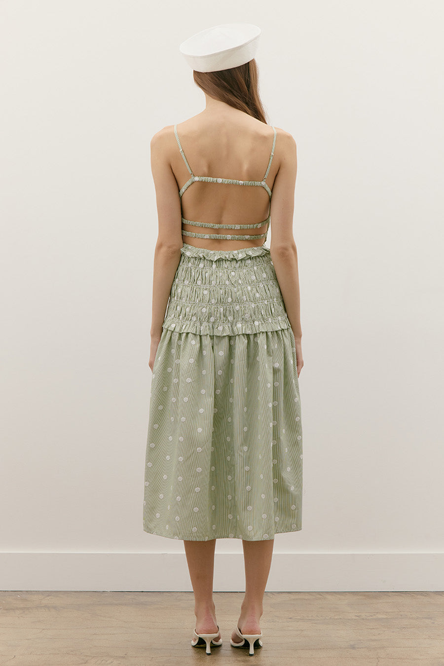 EMBROIDERED DOT SMOCKED MIDI FLARE DRESS WITH OPEN STRAPPY BACK