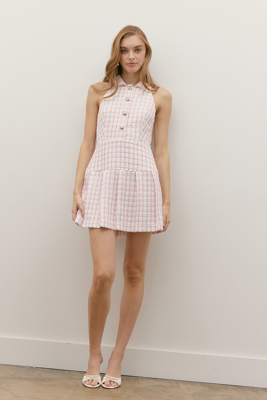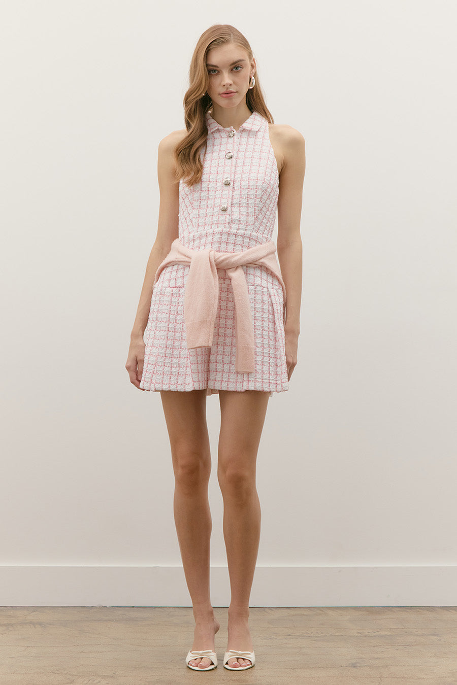 RIBBON TWEED HALTER POLO MINI PLEATED DRESS