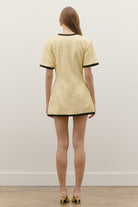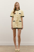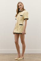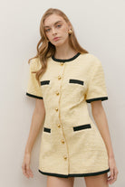 TEXTURED RUFFLE GRID A-LINE SHORT SLEEVE MINI DRESS WITH GOLD BUTTONS